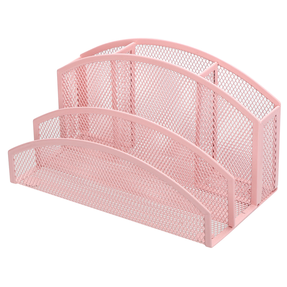 Je suis vraiment ravie de cet organiseur de bureau, surtout dans la couleur rose clair qui est tr��s douce et ��l��gante. Il apporte une belle touche de couleur sans ��tre criard, parfait pour un bureau f��minin ou un espace de travail un peu d��co.Le design �� plusieurs compartiments est super pratique : je peux y ranger mes stylos, carnets, lettres et petits accessoires sans que tout s����parpille sur le bureau. Il ne prend pas beaucoup de place, mais il permet de garder une vraie organisation au quotidien.La maille m��tallique donne une impression de solidit�� et le tout est bien fini, sans asp��rit��s ni bords coupants. Les patins en dessous ��vitent que ?a glisse, donc pas de souci m��me sur un bureau laqu��.En r��sum��, c��est un excellent rapport qualit��-prix, aussi pratique qu��esth��tique. J��adore le look moderne et la qualit�� du mat��riau : il fait tout de suite plus ordonn�� et pro sur mon bureau !